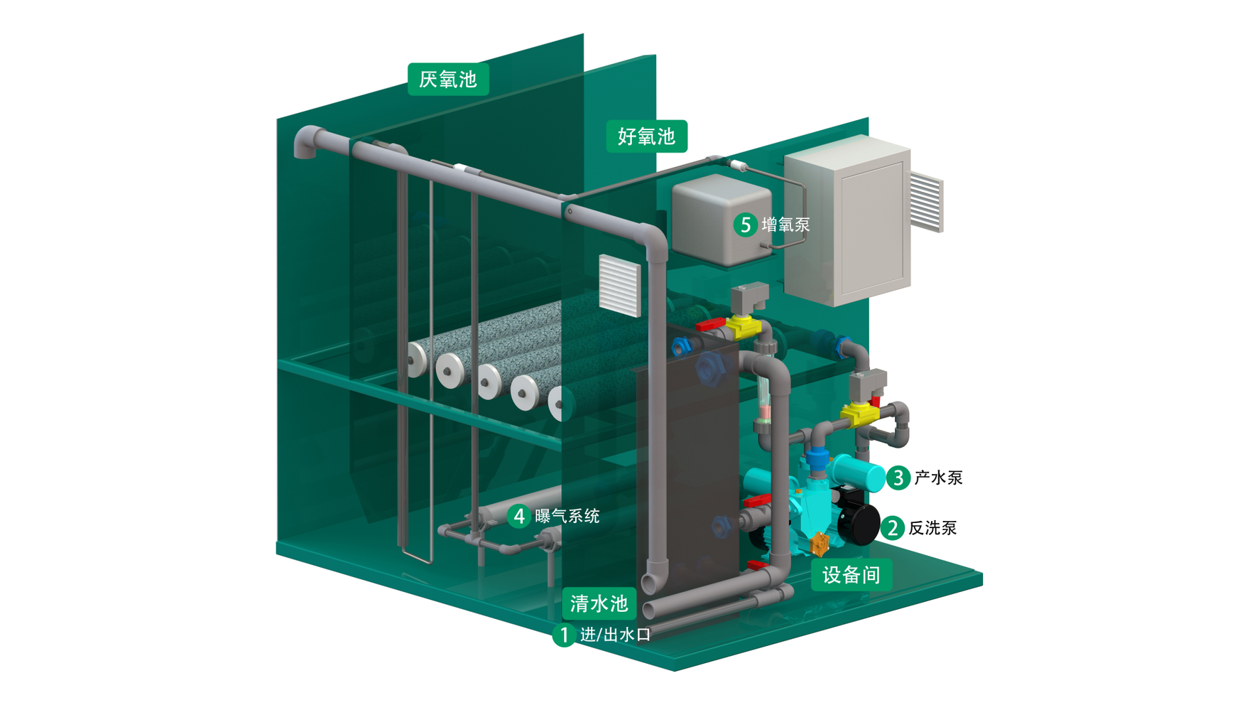 无传统污水处理的厌氧池、缺氧池、好氧池,本设备根据时间进行好氧、厌氧、沉淀、过滤等污水处理过程,降低设备占地面积。